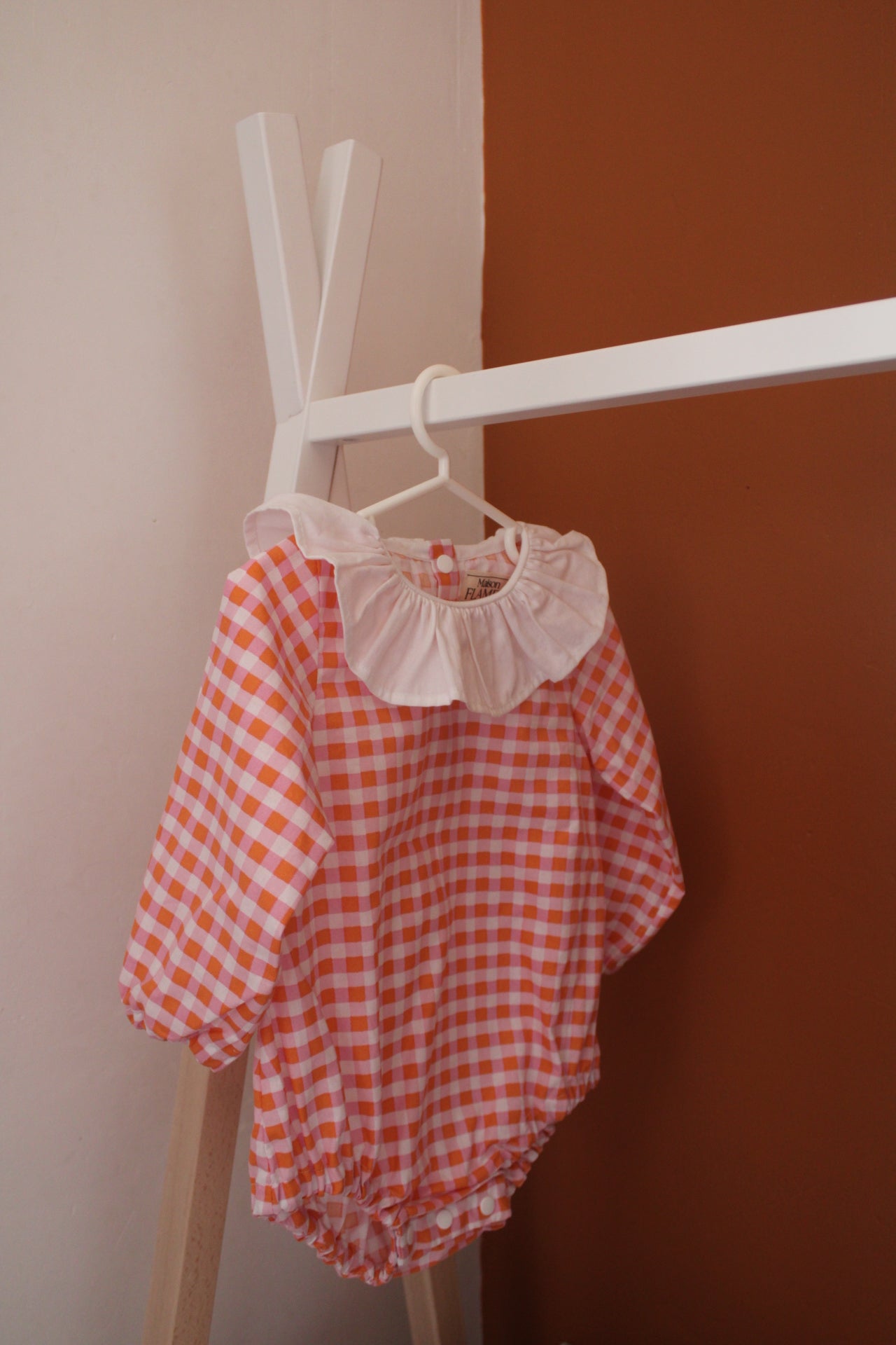 Barboteuse à carreaux orange et rose, avec col volanté blanc, parfaite pour habiller bébé avec style et confort. Son grand col apporte une touche élégante et raffiné. Pratique et confortable, elle est dotée de manches longues, de pressions à l’entrejambe pour un change facile et d’un tissu léger et respirant qui respecte la peau délicate de bébé.