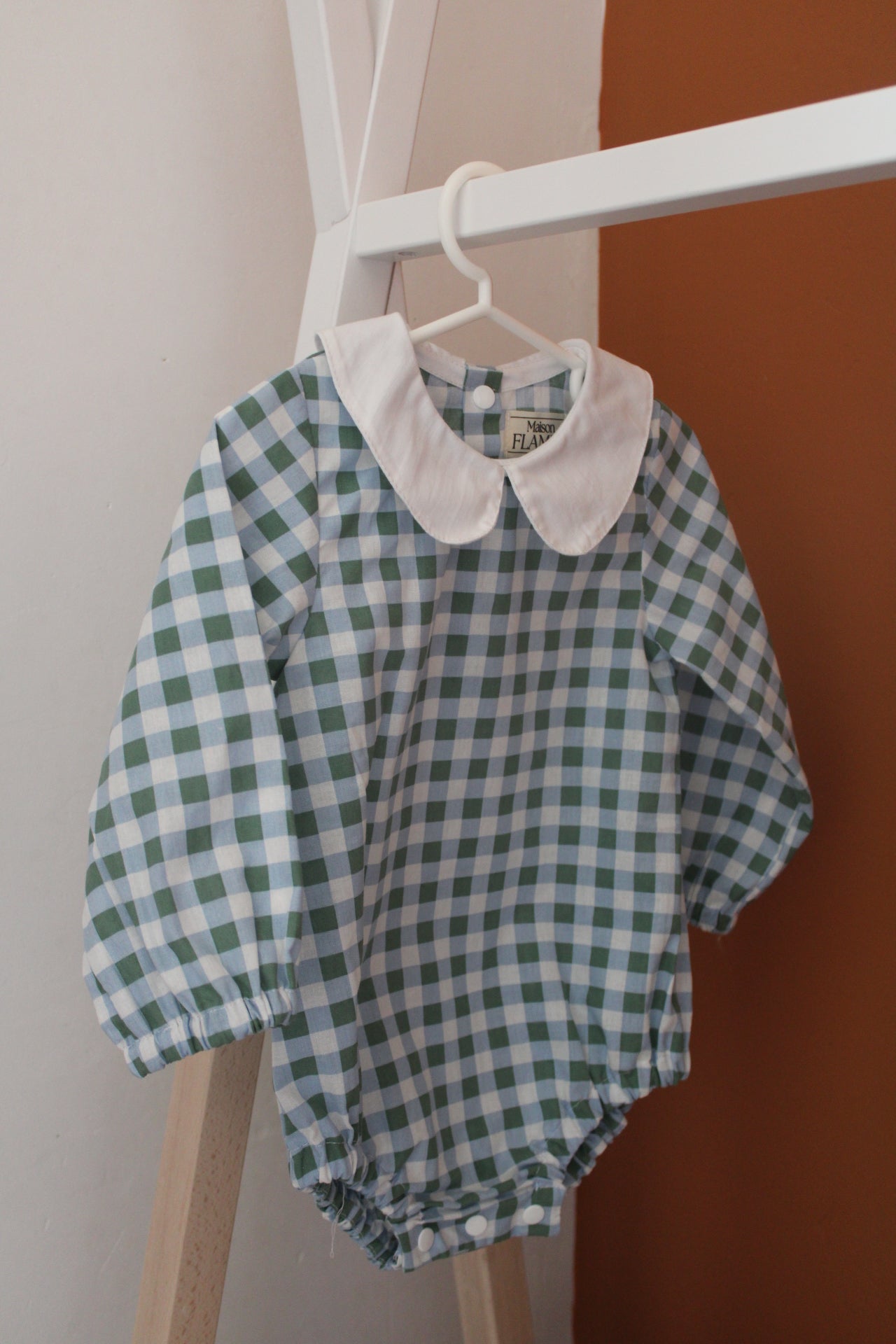 Barboteuse à carreaux vert et bleu, avec col claudine blanc, parfaite pour habiller bébé avec style et confort. Son col ajoute une note chic et délicate. Avec ses manches longues et ses pressions à l’entrejambe, elle allie praticité et style pour accompagner bébé en toute occasion.